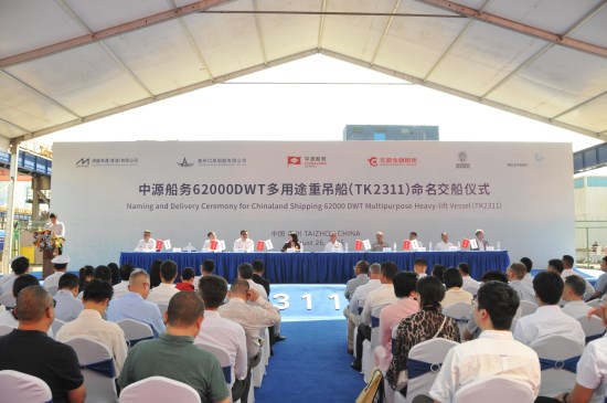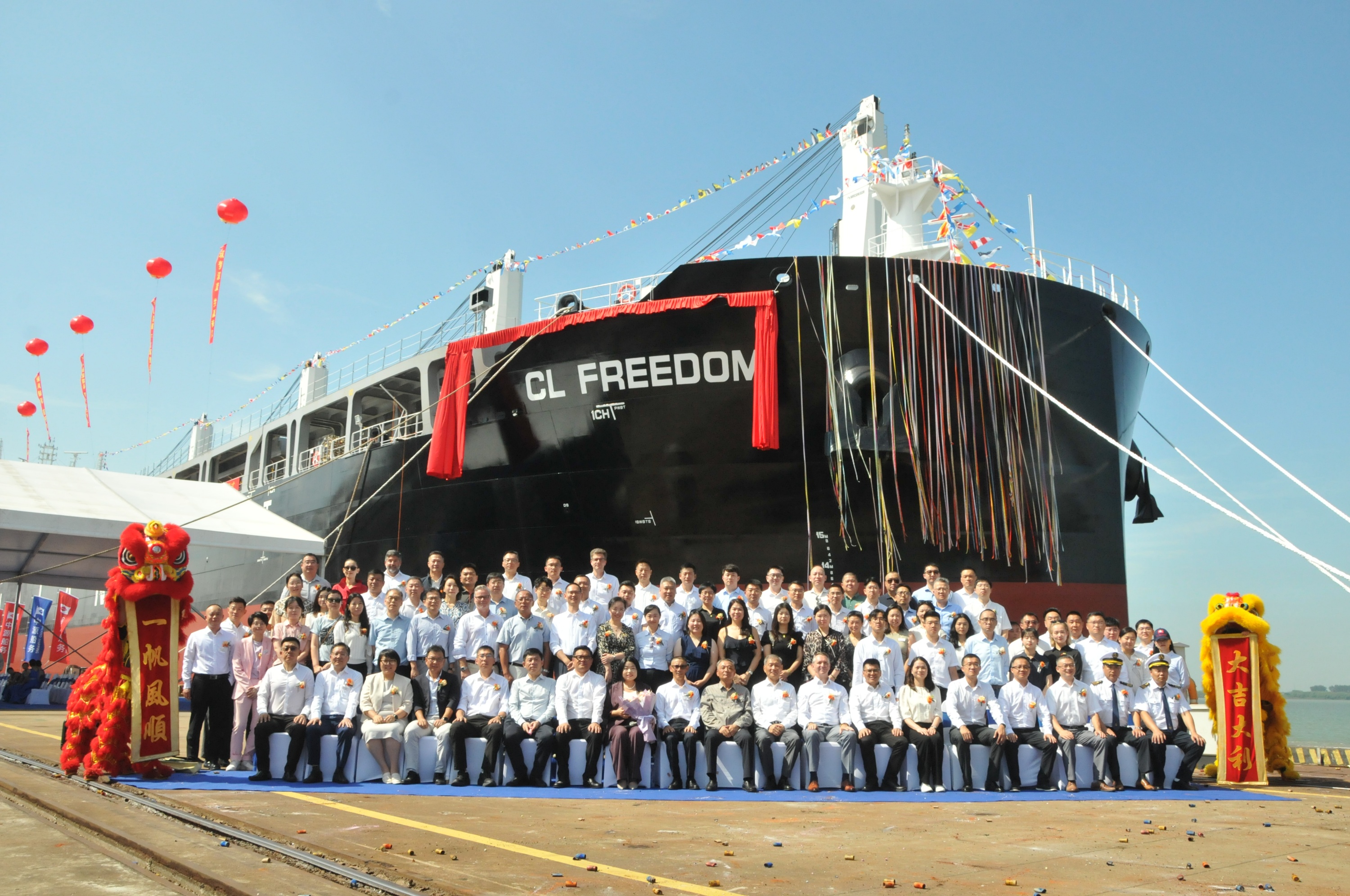 8月26日上午,口岸船舶为浦盛海运(香港)有限公司建造的第四艘62000吨多用途重吊船“CL FREEDOM”轮隆重举行命名交付仪式。中源船务董事长刘春山、浦盛海运总经理毛思远、华夏金租航运业务部总经理李飞、BV船级社高级副总裁葛思越、口岸船舶董事长戚文川、总经理张涛等领导和嘉宾出席仪式。新船教母、施璐德文船重工董事长许秋石女士为该船命名、揭幕、敲香槟祝福。