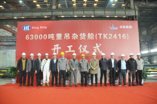 10月28日上午,香港金希普航运订造的63000吨重吊杂货船首制船(TK2416)点火开工,香港金希普航运董事长朱达明、劳氏船级社(LR)中国区总裁杨宵峰、口岸船舶董事长戚文川等领导和嘉宾出席仪式并合影留念。该型船总长199.90米,型宽32.26米,型深19.30米,设计吃水11.30米,设计航速13.6节,入级LR。