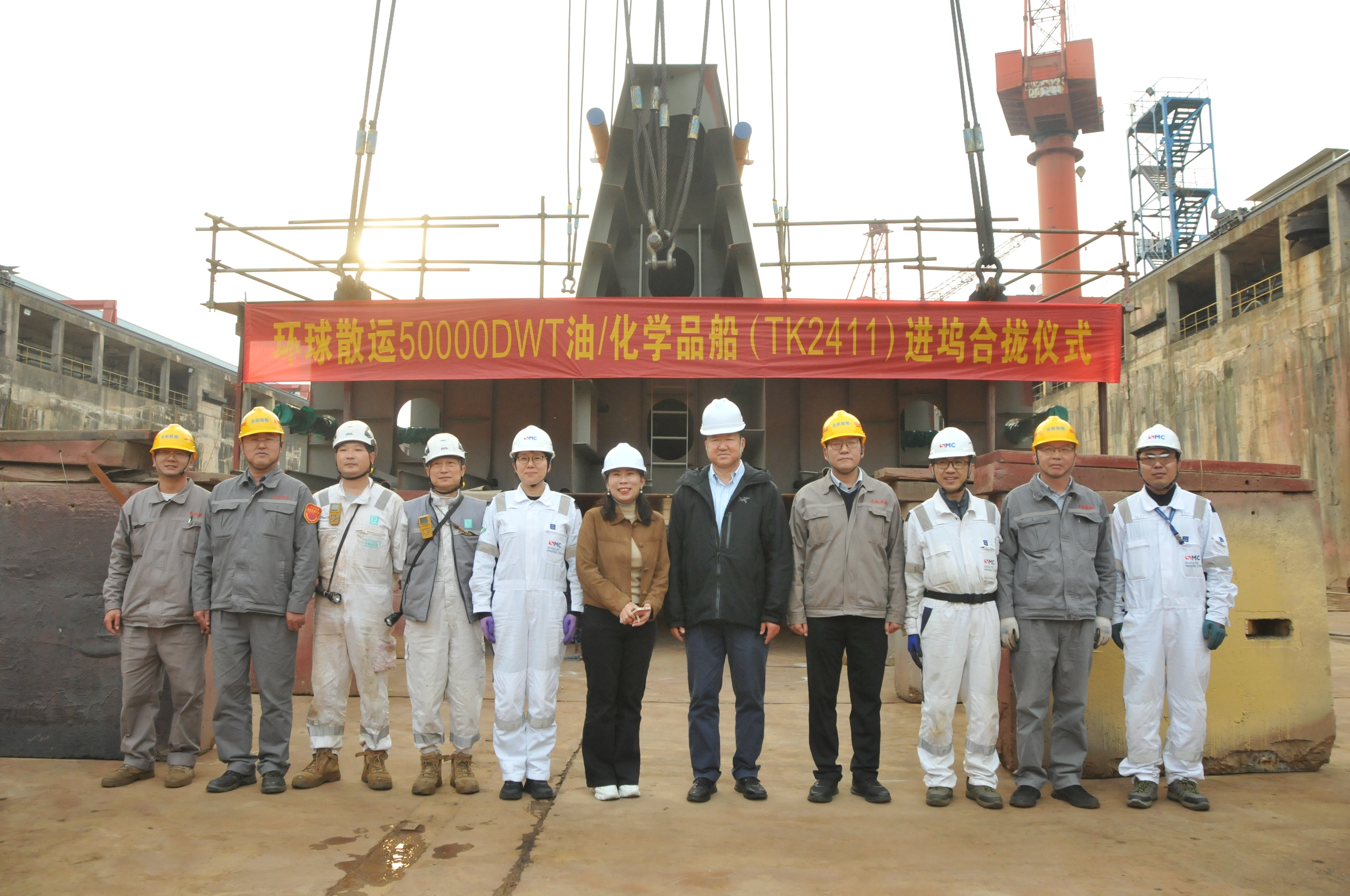 10月27日,环球散运订造的50000DWT油/化学品船(TK2411)进坞合拢。该型船总长182.75 米,型宽32.20米,型深19.10米,设计吃水11.00米,设计航速14.5节,入级LR。