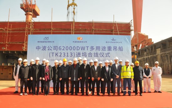 11月28日上午,泰州口岸船舶为嵊泗浦盛海运建造的第6艘62000吨多用途重吊船(TK2313)举行进坞合拢仪式。中波轮船股份公司中方总经理周菁徕、波方总经理马切依·温皮茨基、浦盛海运总经理毛思远、泰州口岸船舶董事长戚文川、总经理张涛等领导和嘉宾共同参加仪式。