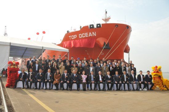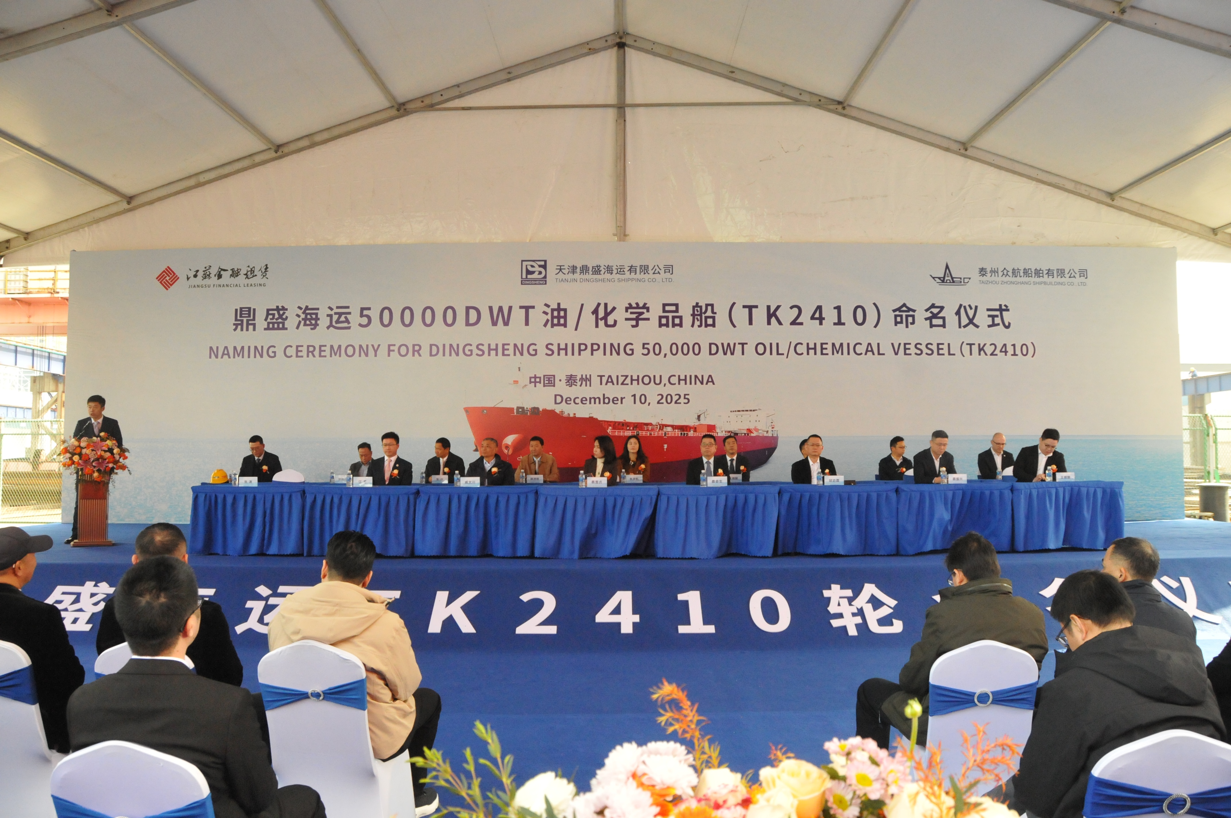 12月10日上午,泰州众航船舶有限公司首制50000吨MR油/化学品船隆重举行命名仪式。鼎盛海运董事王明焕、众航船舶总经理张涛、江苏金租副总裁江勇出席仪式并致辞;鼎盛海运副董事长蔡命生、总经理邱功霖、常务副总经理蔡振兴、众航船舶董事长戚文川、上海船舶研究设计院科技委主任王刚毅、劳氏船级社高级顾问薛茂根、克拉克森上海代表处副总经理钱立武、卫狮上海运营总监Capt.Murat等嘉宾出席仪式。教母蔡雪贞女士命名新船为“TOP OCEAN”轮,并揭幕、敲香槟祝福。